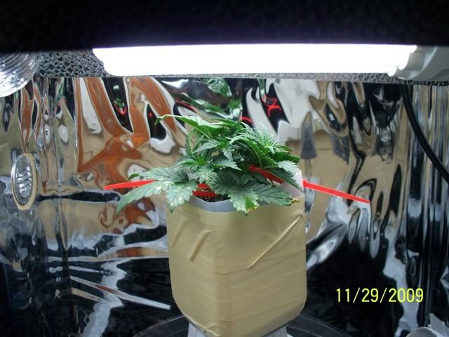 The fan will help, but the lights need to be closer and some reflective walls around the plant will help bounce back some of the light your loosing. The discolor is nutes as already stated by camoxnhx. Dont know if you started the seed in that pot, it might need re potted. Good luck:rasta: