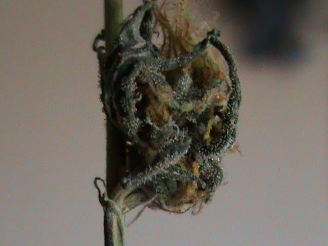 This was cut off the bottom of one of the clones on week 4 in. way to early i know but wanted a sample taste before major harvest, i only took off one lil node with two lil nugs! mmm mmm tasty! cant wait to taste the real crop!