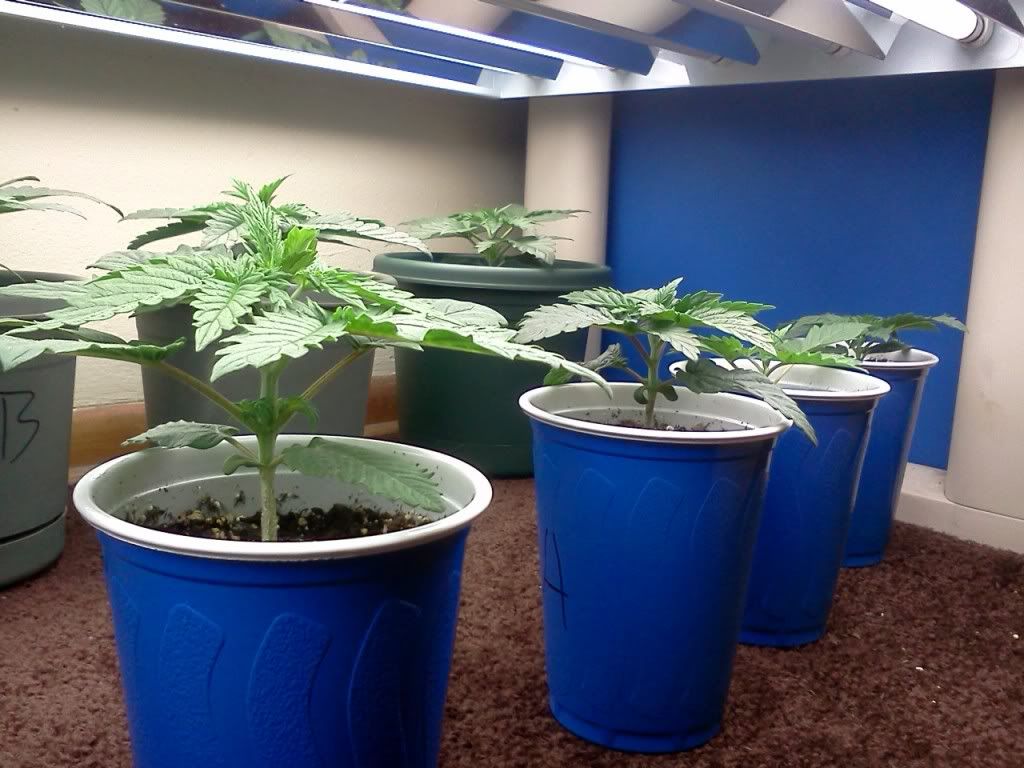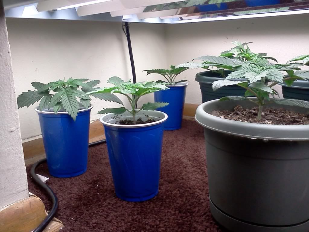 LOL. Cups have drain holes, they get watererd in the tub till they finish draining. And there is plastic under the carpet. I'm in an apartment so everything is ready to be broke down and moved in a matter of minutes. And I do got a fan, blows from one end to the other, that's why my dog sleeps in front of the closet Lmao. O, and remember that the ones in blue cups will be going bye bye here in a few days. Actually I should be hardening them off now. Haven't grown outdoors in years. This will be fun. Peace. O, and the green pots don't hold water. They normal round 6" pots. Water them in tub till they stop dripping too