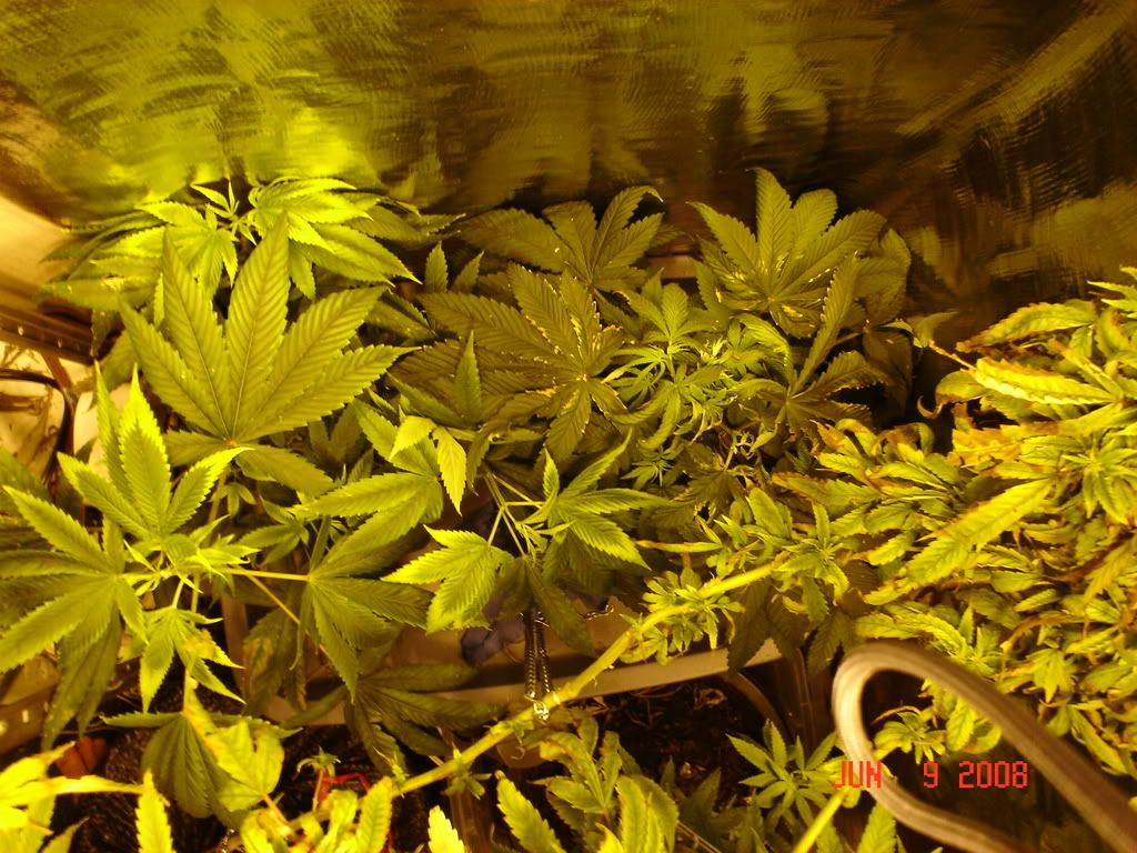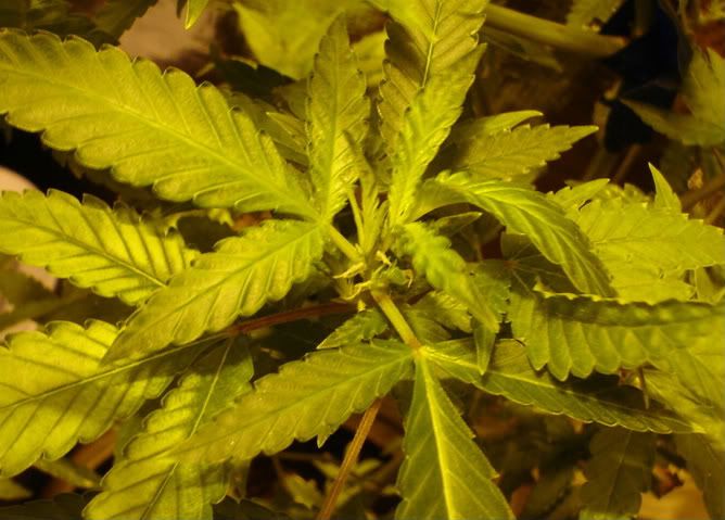 But, I think somethings wrong with her. She might have a slight Potassium deficiency. Are those leaves yellow at all? Its pretty hard to tell the real colour when she's under the lights. Correct me if I'm wrong, please.