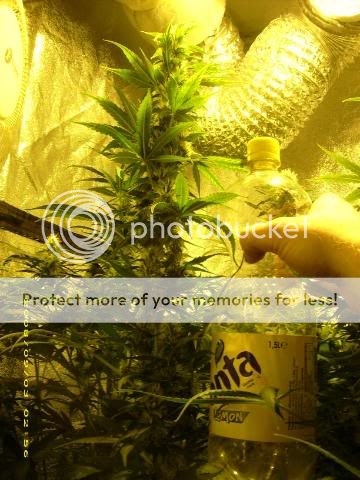 First one is that 20 inch bud formation on one out of 6 main stems of plant 5. The bottle is a 1.5 litre (50 Oz) hehe.