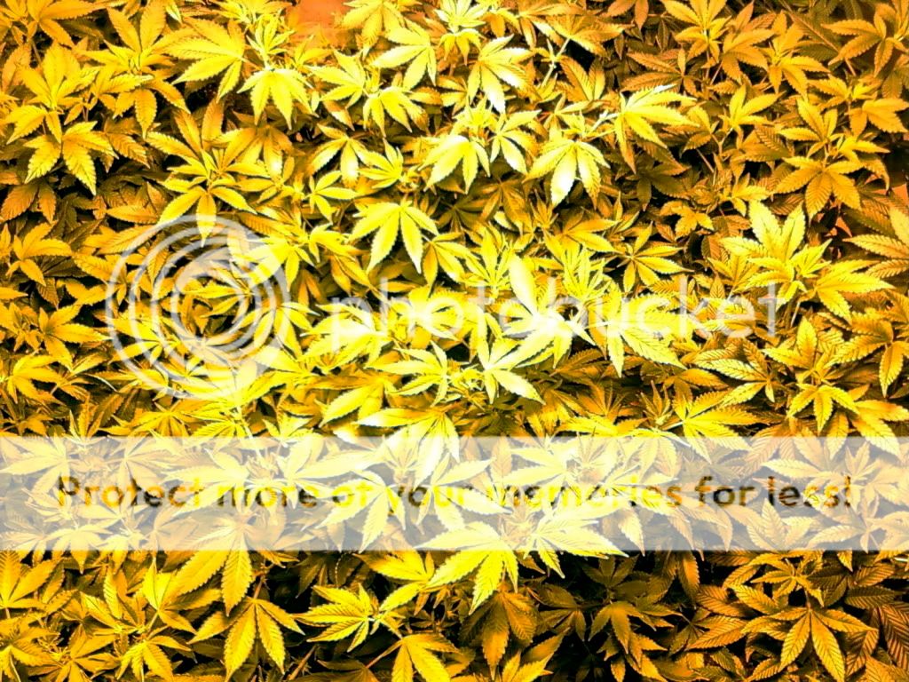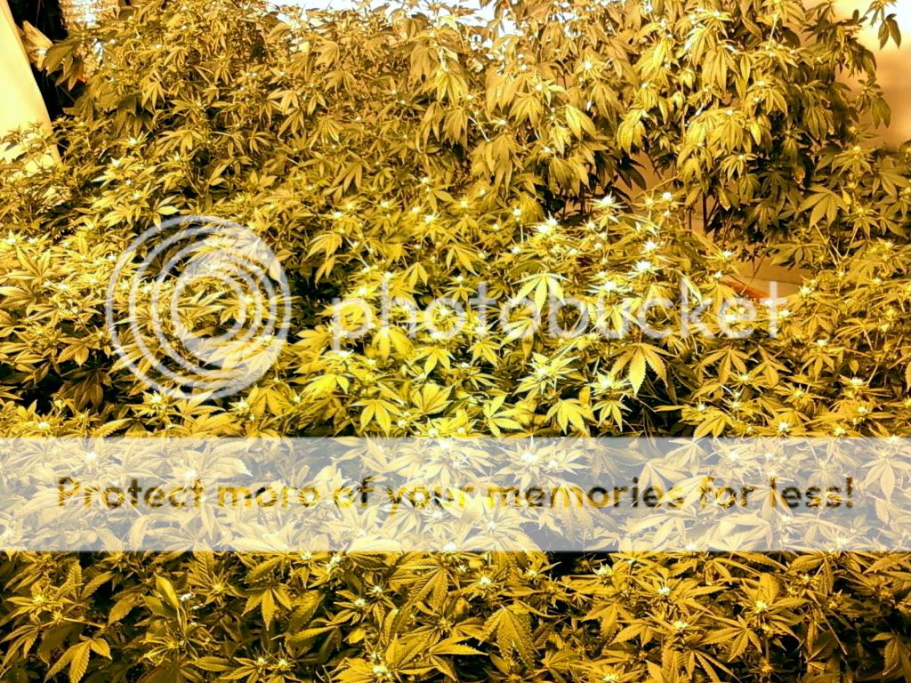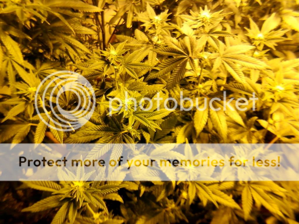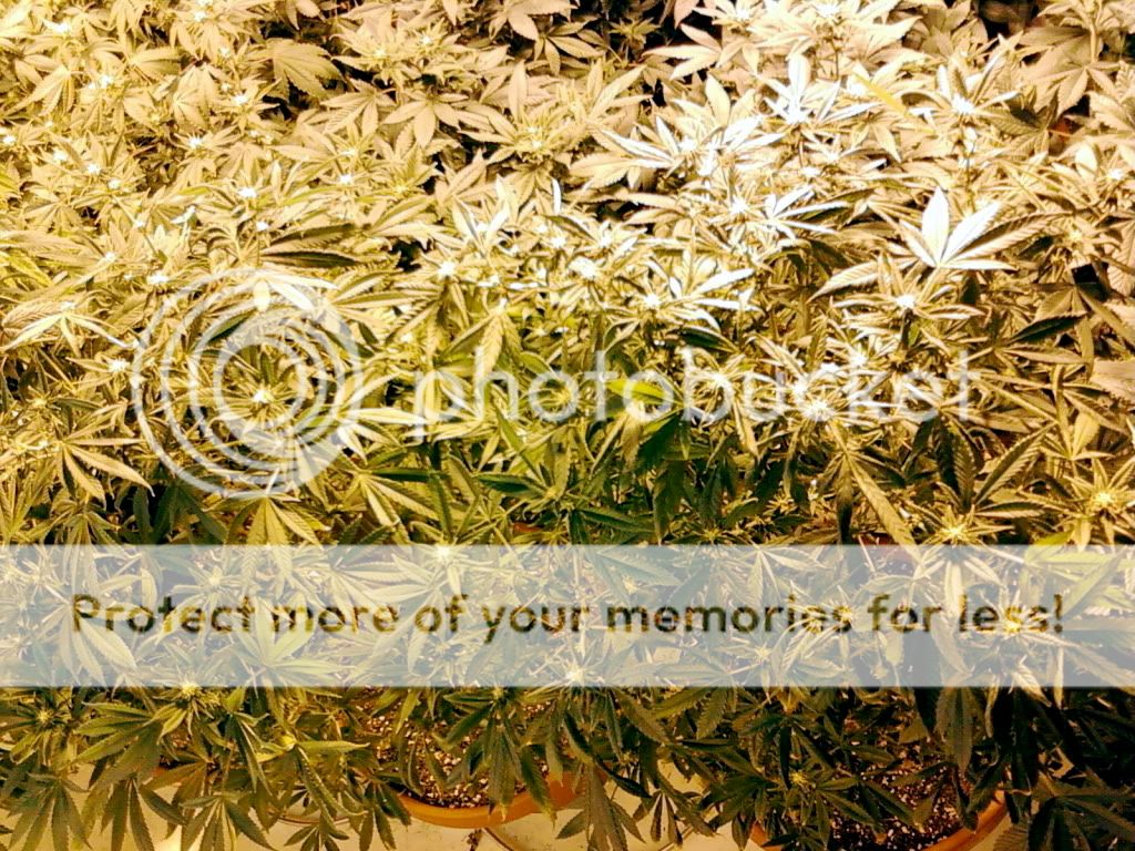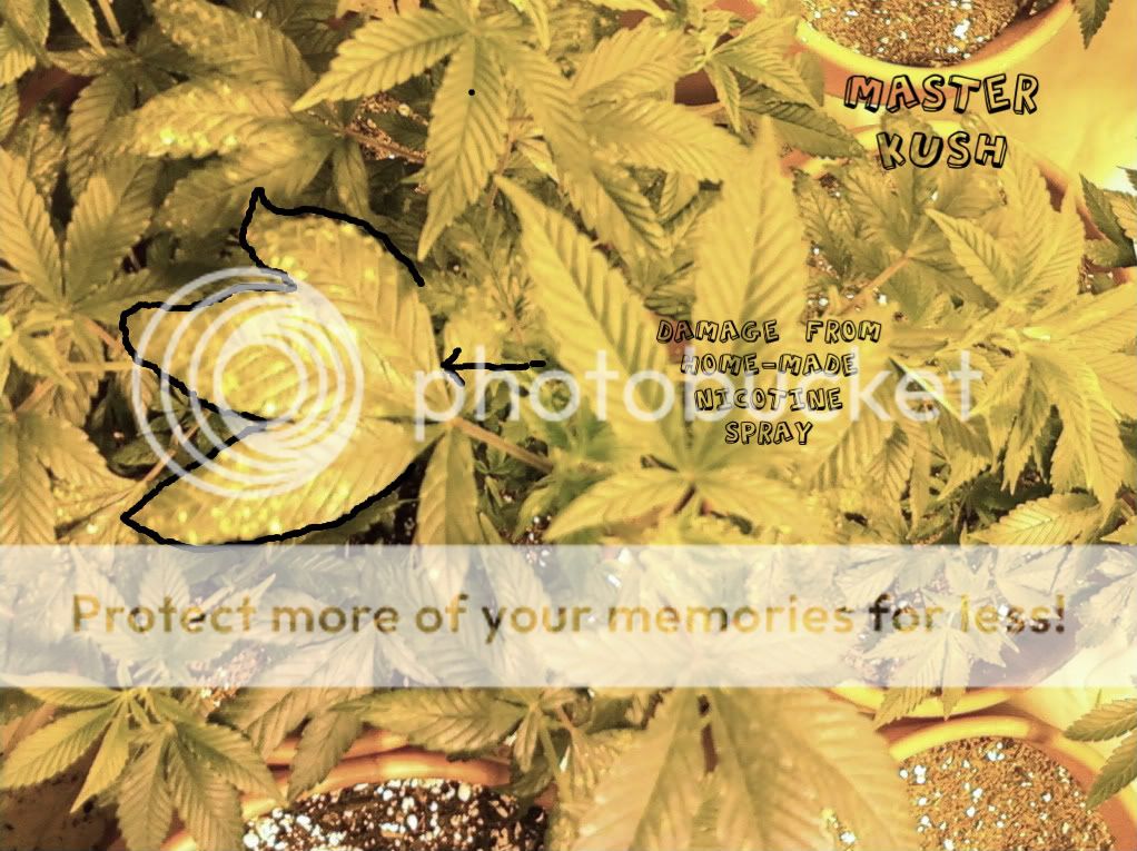 So... it's been a while! And in that time, things have gotten better and worse! We've been topping all of the girls, and they are reacting very well to that! Much denser bushes, with thicker stalks. On the other hand... we have 4 White Widow that are behind. I think it was over watering. The pots were pretty heavy in comparison to the others. So I've been watering them every other day. They have begun to grow steadily. But the worst problem that has plagued our grow is... SPIDER MITES!!! We caught them early and tried multiple methods to take them out. But we had no result! We got the Hot Shot Pest Strips, tried Sevin and another insecticide i can't remember, made a nicotine spray (which included tobacco, garlic and a sliver of soap)... and now, with those little bastards continuing to have a field day on our plants... I'm pulling out, what i've been told is, The Big Guns! We were recommended Mite-Rid. Surprised i hadn't found it myself. But i'm crossing the fingers at this point. What a pain in the ass, spider mites. Well, if all goes well, and it works... it looks like bloom could be only a few days away! OH AND... the nicotine spray damaged our Master Kush. Only the Master Kush, though. Kid of odd. There's a picture showing it, below.