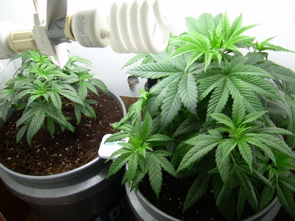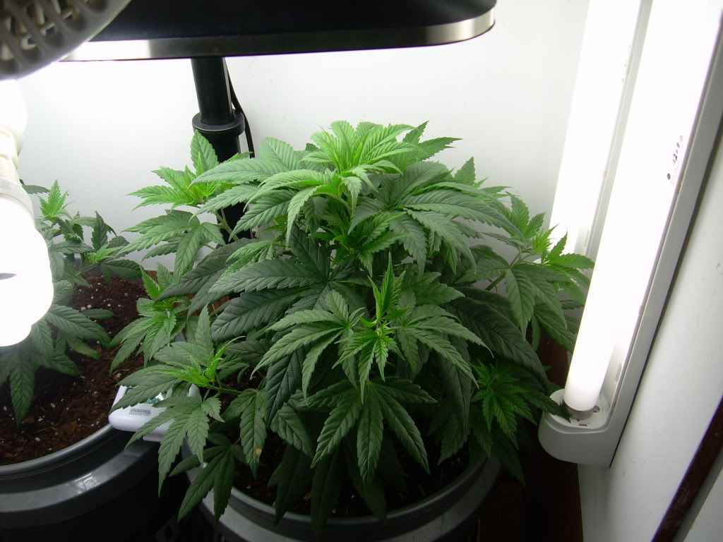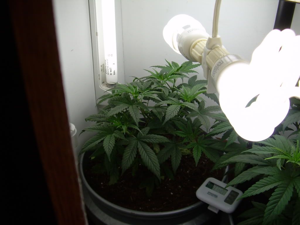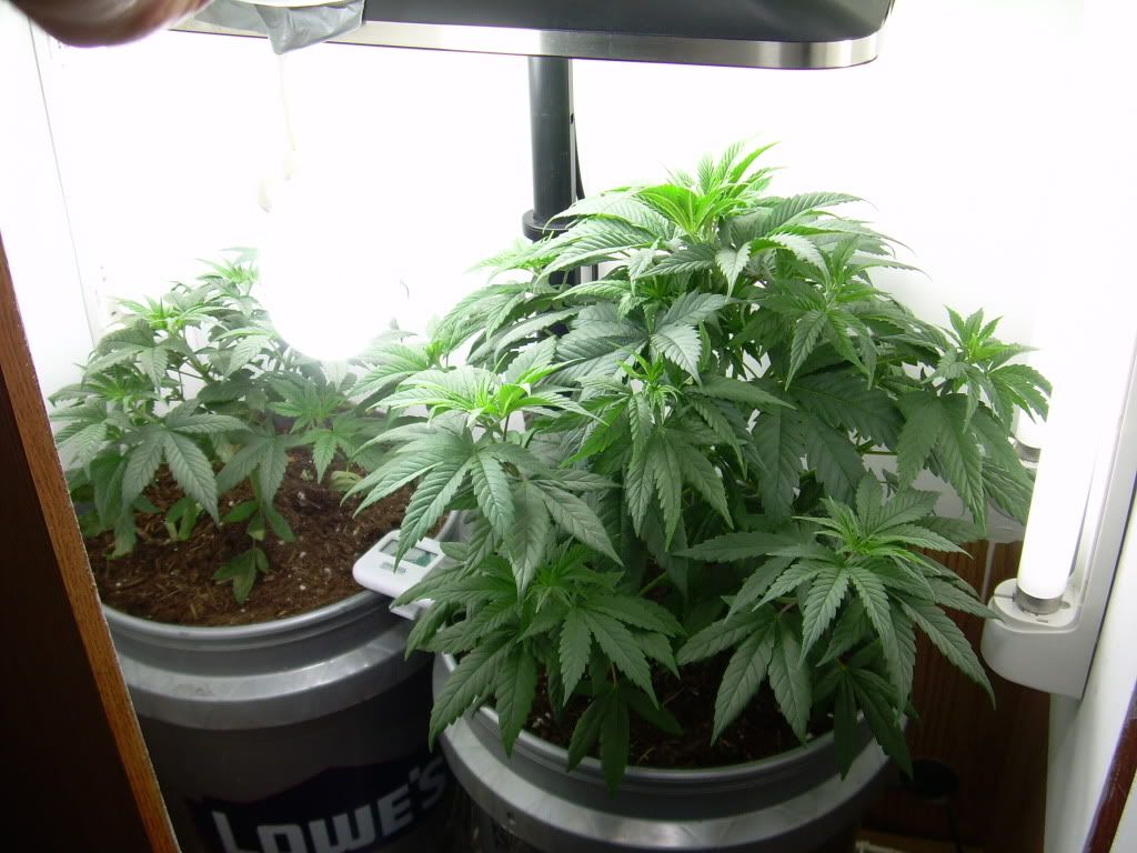 i started with 3 seeds 1 didn't pop. i germanated with the good ole papertowel bowl and saucer trick. moved them to peat pellets and have repotted them twice since the inital greenhouse phase. Im in week 5 and have just repotted to 5 gal buckets. Plant A is untrimmed compleatly and plant B ive topped and trimmed and i think im gonna do some LST on it once it recovers. im going to start flowering at the end of week 6 or maybe week 7. Im using 215w actual of florecent lighting at 5500k whitch gives me around 4875 lumens per square foot overall. While i am using miracle grow products i am being very careful not to over do the feedings about 1/2 the recomended dosage of tomato nutes whitch is 18-21-18. i do that once a week and just plain water every other time i started that at the begining of week 4. As the MG micro max already has nutes in it ive read its really easy to burn your plants but ive also readt that you can be sucessful if your careful. Also ive added about 30% perlite to the mix whitch you really cant see on the top but i promise you its in there.