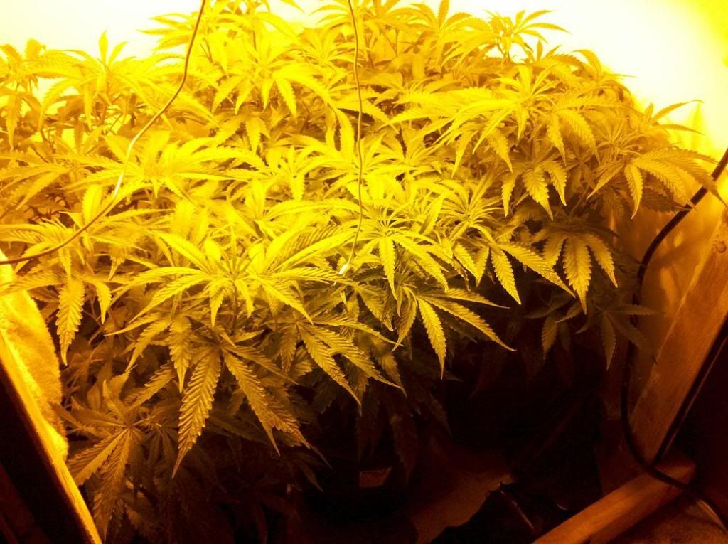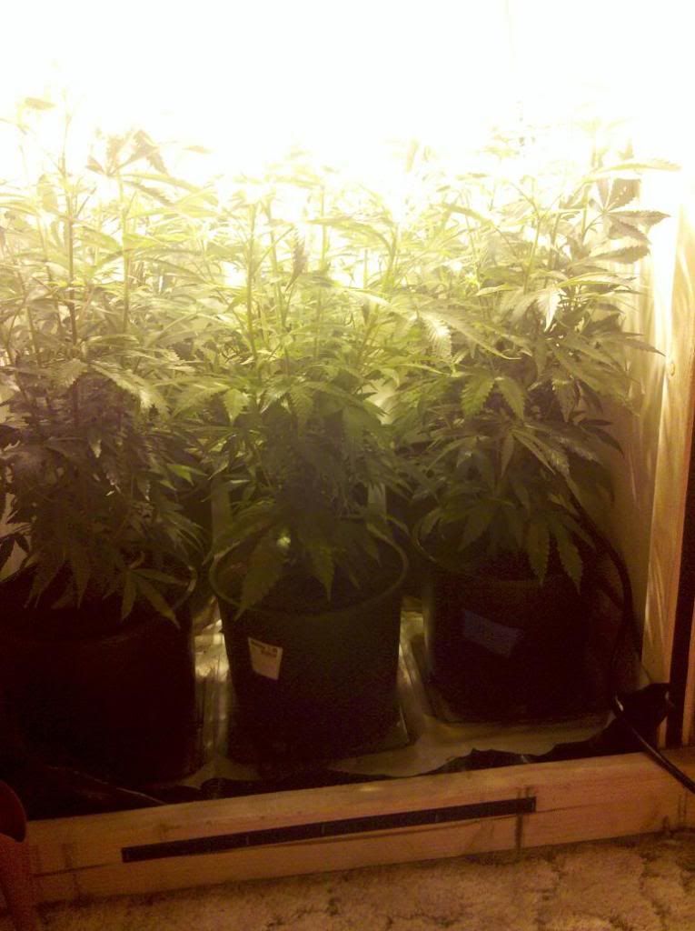ok well its been a couple of weeks since i last logged. Everything has been going well. I increased the amount of nutrients that i was giving the plants which made them get darker like they should be. These pics are of them today. The tallest one is 20in the shortest one is 18in. I topped them all when they were about 5in so they have gotten really bushy and have filled in the area very nicely. I have a very thick canopy now. I just started flowering last night and they have already started to grow very quickly.