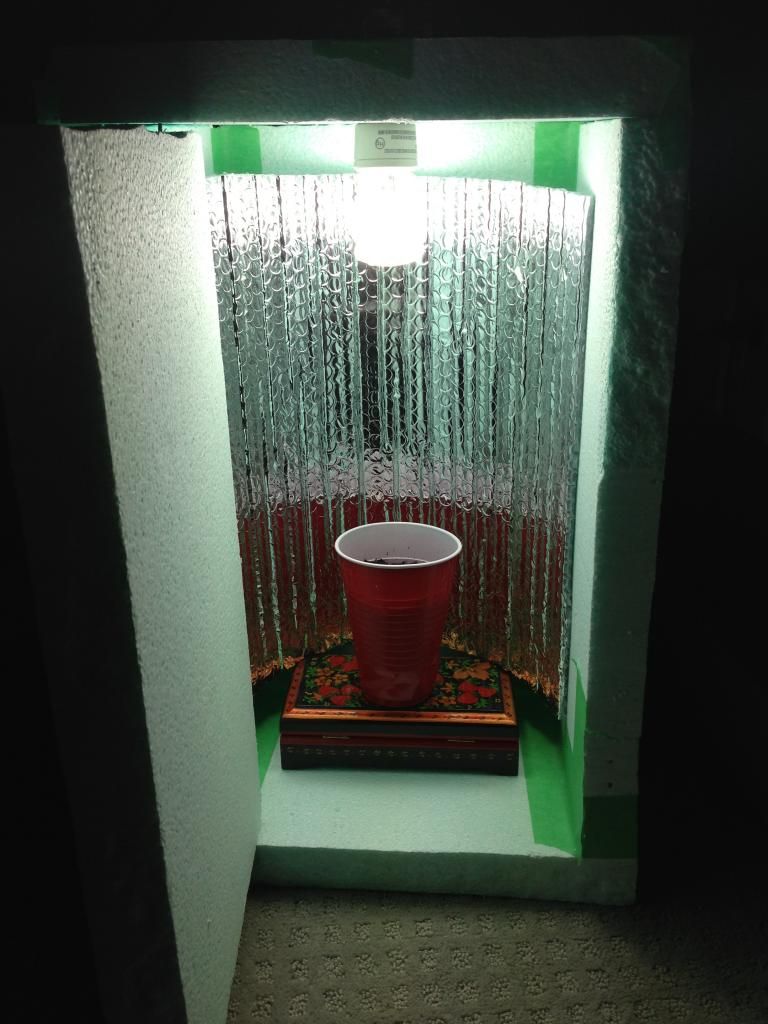 While my actual box is being built by a carpenter I decided to make a smaller scale version just to get the seed started made out of Styrofoam and an old lamp I had laying around the house with some rfoil which reflects 98% of radiant heat Doesn't absorb!